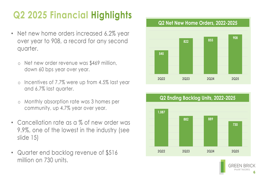 Green Brick delivered 1,042 homes in Q2 2025, a 5.6% increase year-over-year and a company record. However, home closings revenue remained flat at $547 million as the average sales price decreased 5.3% to $525,000, indicating price pressure in the current market environment.