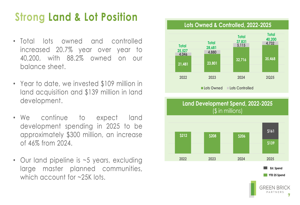 Geographically, Green Brick continues to concentrate on the Dallas-Fort Worth and Atlanta markets, which generated approximately 90% of revenues in Q2 2025. The company strategically focuses on infill and infill-adjacent submarkets, representing approximately 80% of revenues.