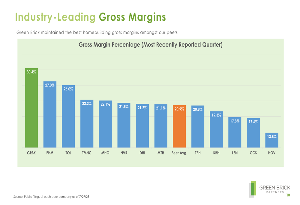 Despite margin pressure, Green Brick continues to lead the industry in gross margins at 30.4%, significantly outperforming the peer average of 20.9%. This competitive advantage is clearly illustrated in the following comparison: