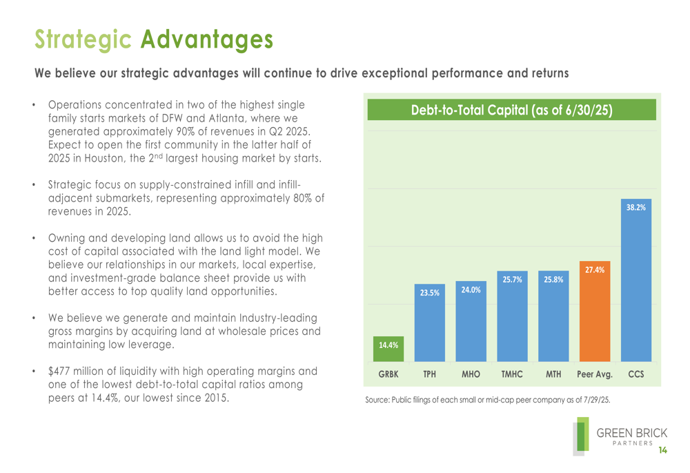 Green Brick maintained a strong balance sheet with $112 million in cash and $365 million in undrawn credit facilities. The company’s debt-to-total-capital ratio improved to 14.4%, its lowest level since 2015, providing financial flexibility in the current uncertain market.
