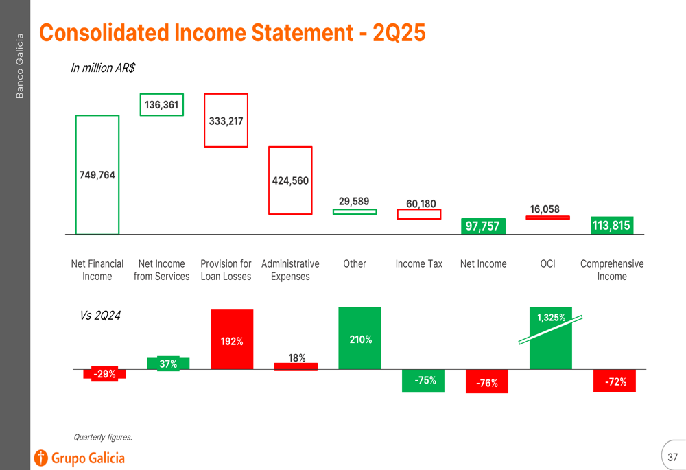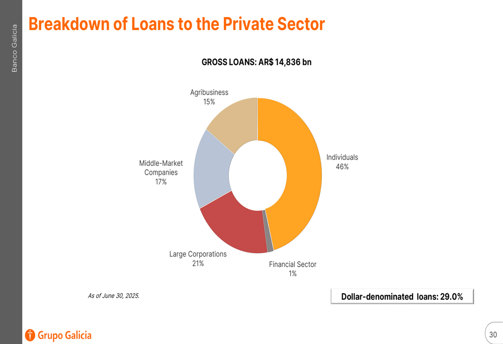 Banco Galicia, the group’s main banking operation, reported an ROE of 7.7% for Q2 2025 and 4.6% for the full fiscal year. With assets of AR$ 30,158 billion (USD 25.3 billion) and a loan portfolio of AR$ 14,412 billion (USD 12.1 billion), the bank maintains a strong position in the Argentine financial system.