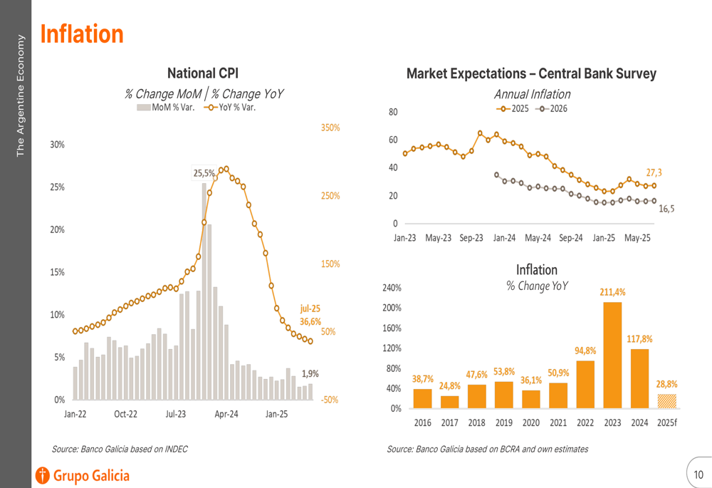 A key macroeconomic factor influencing the banking sector has been Argentina’s declining inflation rate, which has fallen dramatically from 211.4% in 2023 to a projected 28.8% in 2025. This disinflationary trend has created a more stable environment for financial planning and credit expansion.