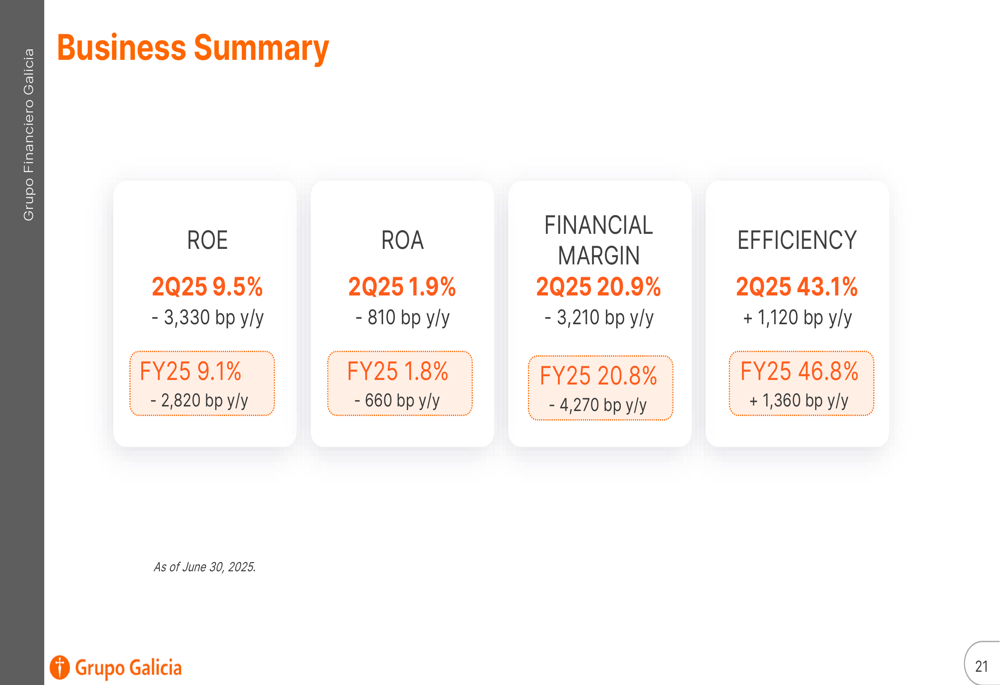 Grupo Financiero Galicia reported a return on equity (ROE) of 9.5% for Q2 2025 and 9.1% for the full fiscal year 2025, with a return on assets (ROA) of 1.9% and 1.8% respectively. The company maintained a solid financial margin of 20.9% in Q2 and demonstrated strong operational efficiency at 43.1%.