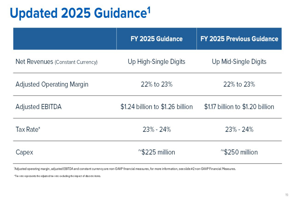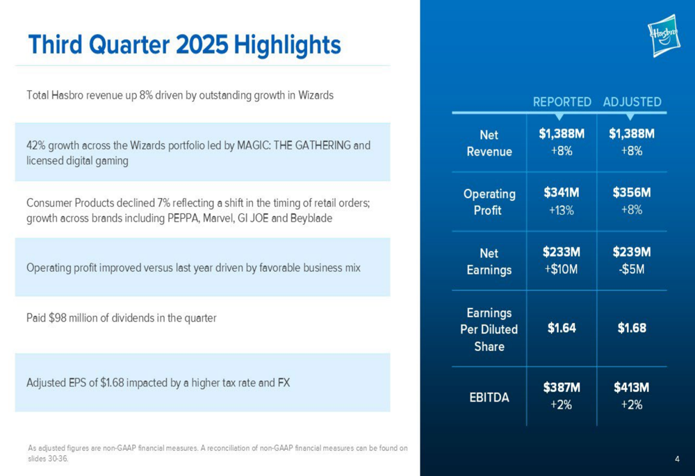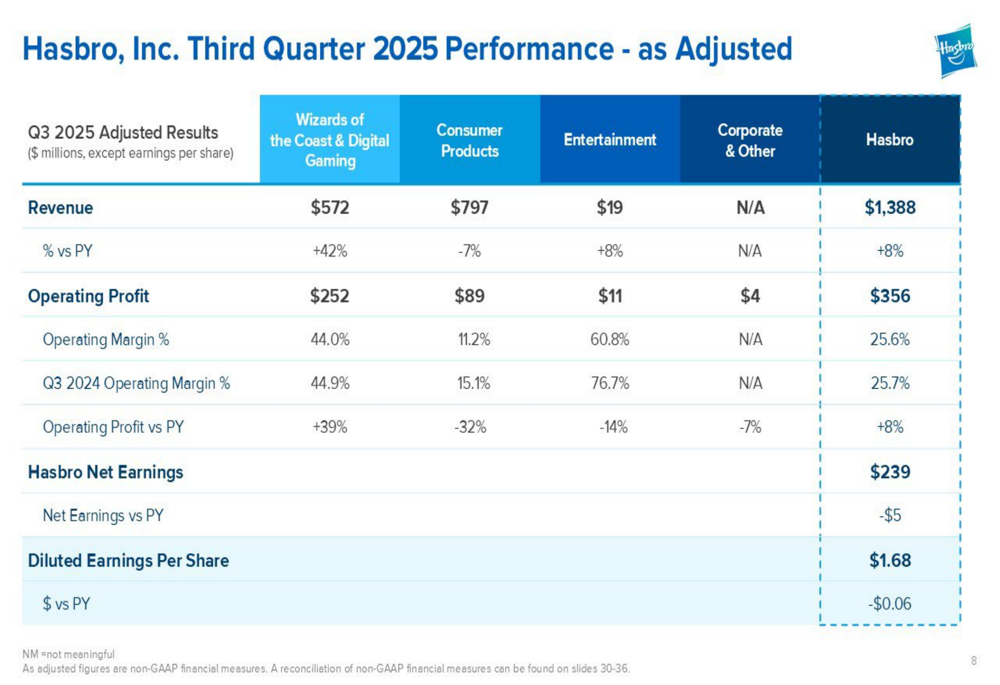 Based on strong performance in the Wizards segment, Hasbro raised its full-year 2025 revenue guidance from mid-single digit growth to high-single digit growth. The company also increased its adjusted EBITDA guidance to $1.24-$1.26 billion, up from the previous range of $1.17-$1.20 billion, while maintaining its adjusted operating margin guidance of 22-23%.