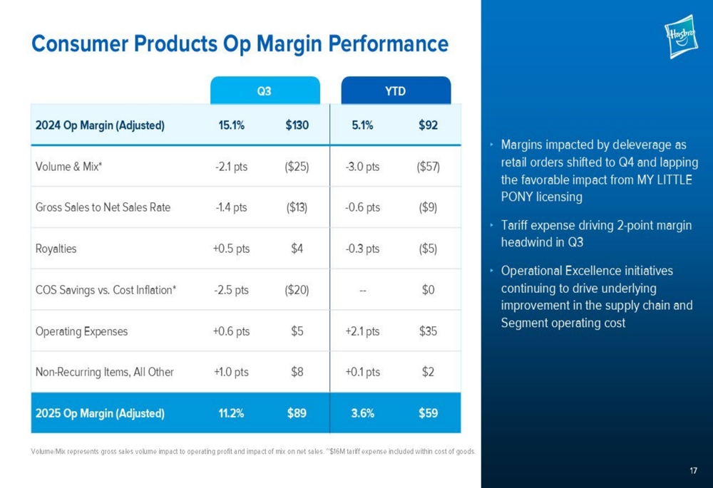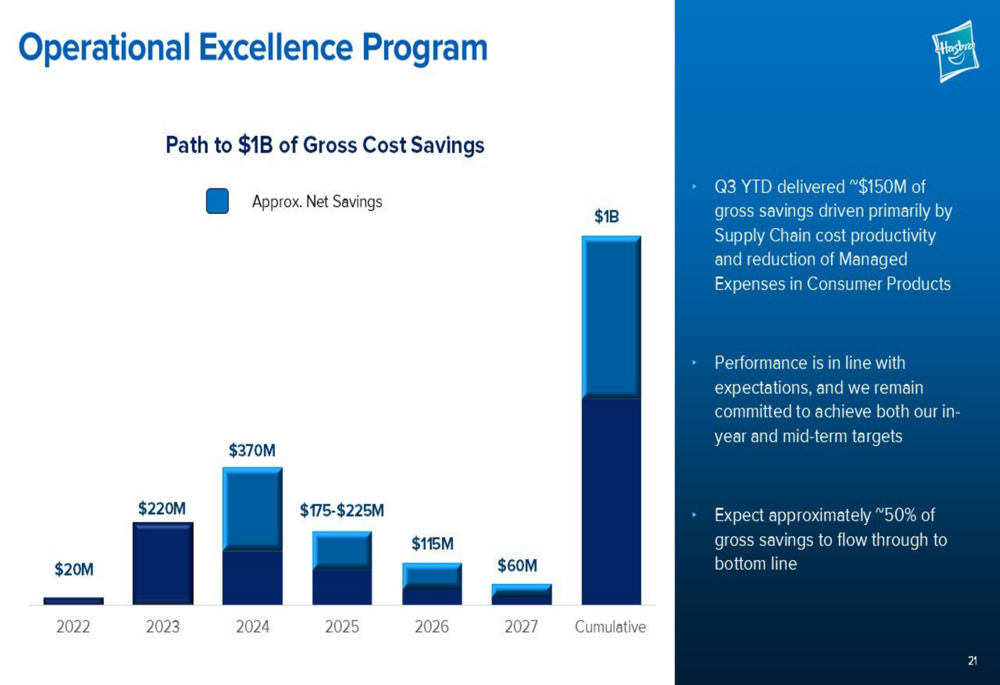 Hasbro continues to execute its Operational Excellence Program, which aims to deliver $1 billion in gross cost savings by 2027. Through Q3 2025, the company has delivered approximately $150 million in gross savings year-to-date, primarily through supply chain cost productivity and reduction of managed expenses in Consumer Products.