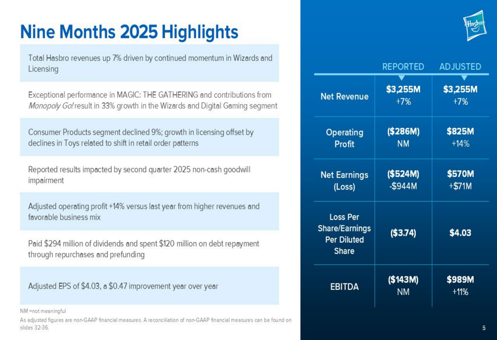 For the first nine months of 2025, Hasbro’s revenue increased by 7% to $3.26 billion, with adjusted operating profit rising 14% to $825 million. Adjusted earnings per share for the nine-month period reached $4.03, up $0.47 from the same period in 2024.