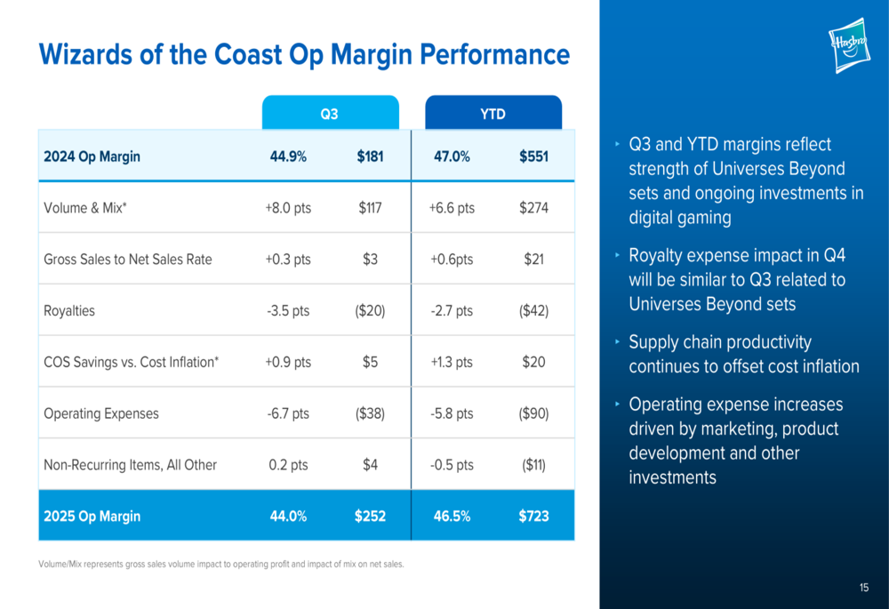 Despite the strong revenue growth, the Wizards segment’s operating margin decreased slightly from 44.9% in Q3 2024 to 44.0% in Q3 2025. This marginal decline was primarily due to increased operating expenses related to marketing, product development, and other investments, as well as higher royalty expenses associated with Universes Beyond sets.