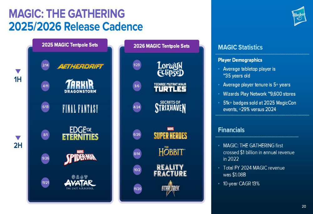 As illustrated in this release calendar and statistics slide, Magic: The Gathering continues to be a cornerstone of Hasbro’s growth strategy:
