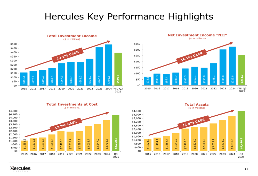 Hercules Capital reported strong financial results for Q3 2025, with total investment income reaching a record $138.1 million, representing a 10.3% year-over-year increase. Net investment income (NII) totaled $88.6 million, translating to $0.49 per share, slightly above analyst expectations.