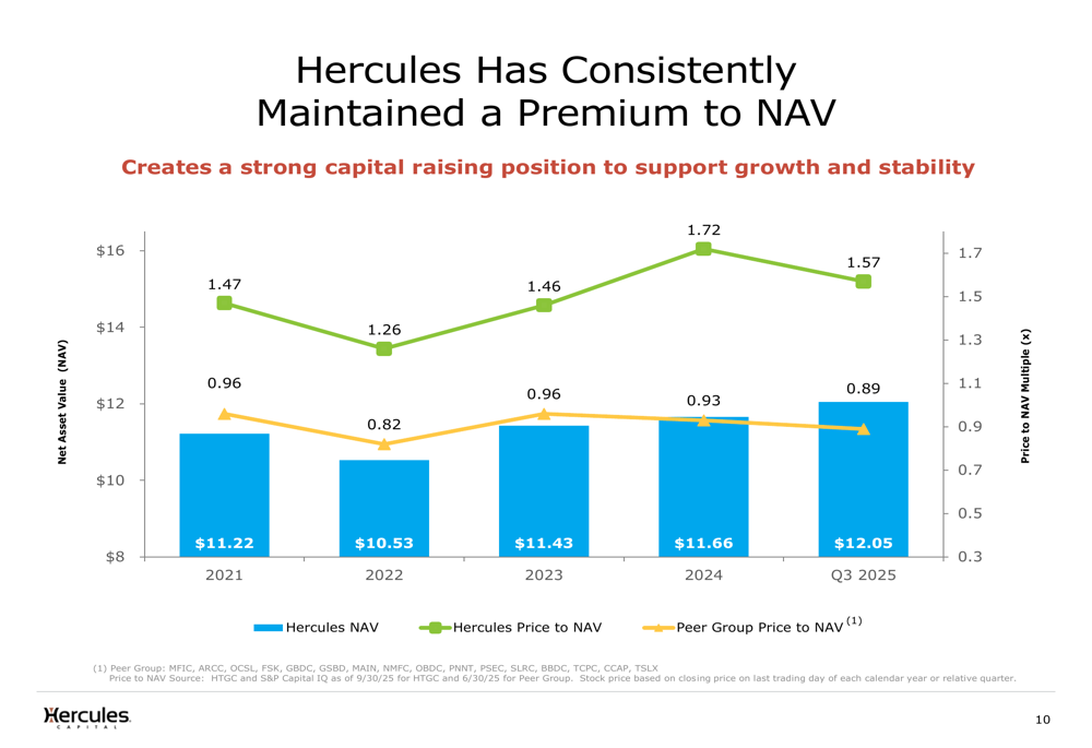 This premium valuation has been consistent over time, with Hercules’ historical price-to-NAV ranging from approximately 0.7x to 1.9x, and consistently exceeding the peer group average. The premium reflects market confidence in Hercules’ business model and management team.