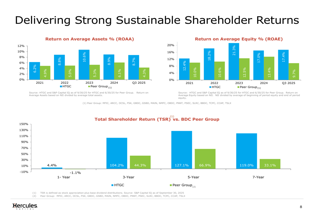 Hercules Capital continues to outperform its peer group across key performance metrics. The presentation highlighted the company’s superior returns compared to industry peers, with total shareholder returns significantly exceeding the peer group across all time horizons.