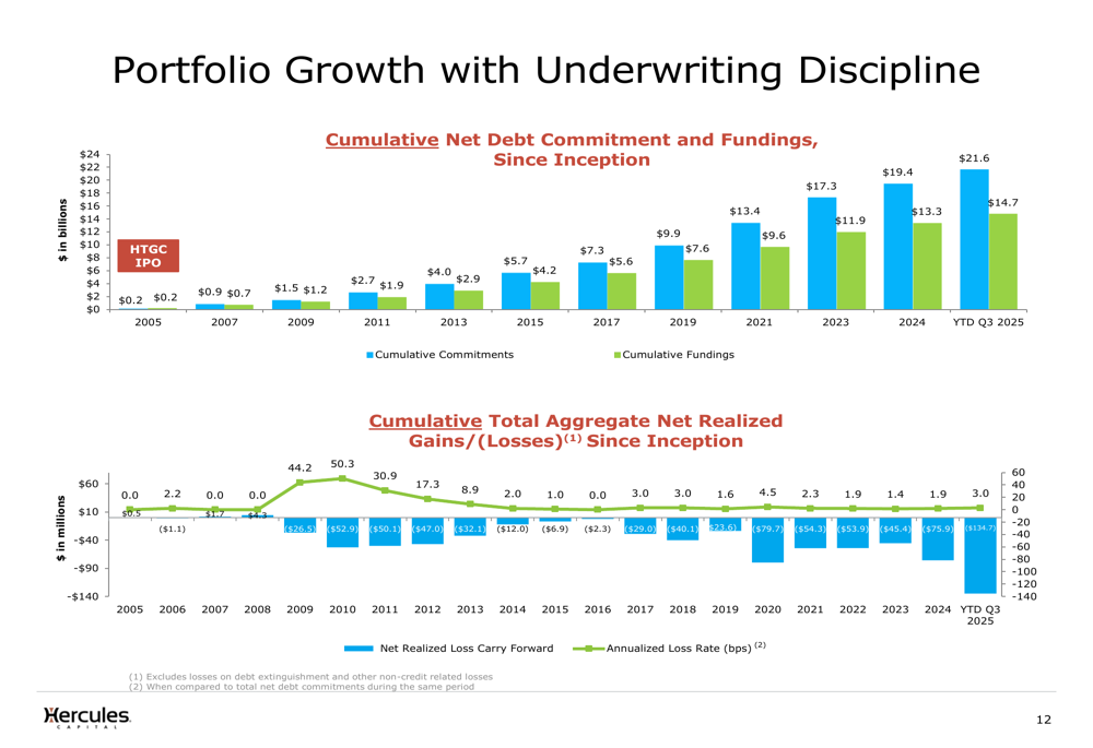 The company’s origination platform has generated $21.6 billion in total net debt commitments since inception, with cumulative fundings of $14.7 billion. Despite this significant lending volume, Hercules has maintained strong credit quality with an annualized loss rate of just 3.0 basis points, or 0.030%, demonstrating disciplined underwriting standards.