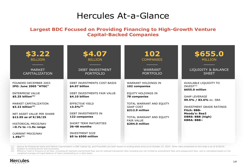 The company’s strong investment-grade credit ratings (Fitch:BBB-, Moody’s: Baa2, DBRS: BBB (high), KBRA: BBB+) provide flexibility for accessing debt capital markets on favorable terms. With GAAP leverage of 99.5% and regulatory leverage of 83.6%, Hercules maintains capacity for additional portfolio growth while remaining within regulatory limits.