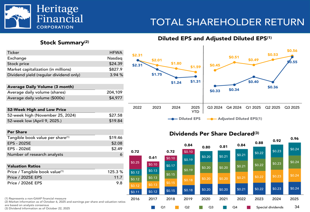 Heritage’s credit quality metrics remain solid, with net charge-offs to average loans at just 0.01% in Q3 2025. The allowance for credit losses on loans stands at approximately 1.1% of total loans, reflecting the company’s conservative approach to credit risk management.