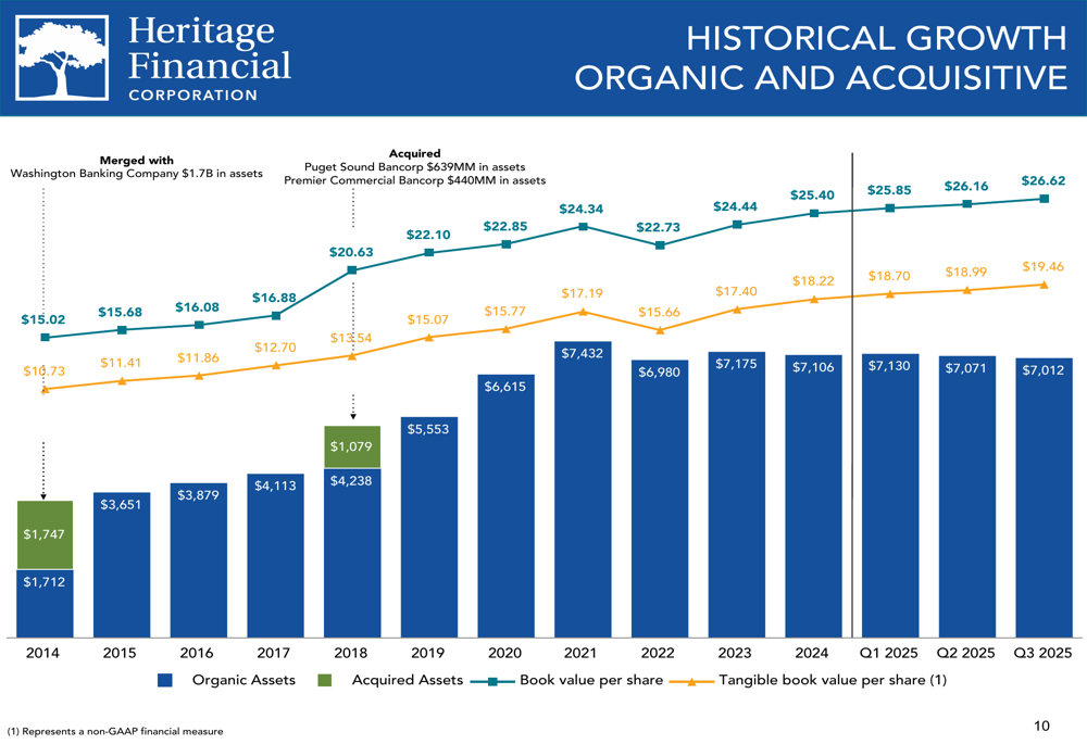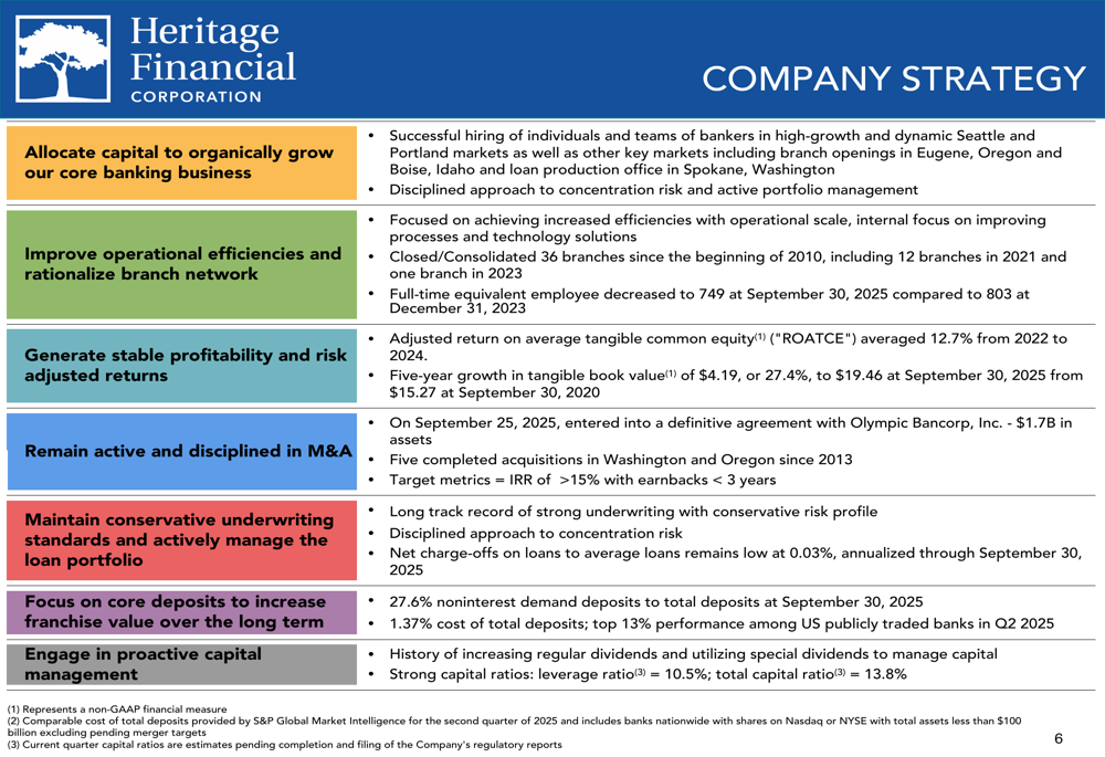 Heritage Financial’s strategic priorities center around building a strong Pacific Northwest regional commercial community bank through both organic growth and strategic acquisitions. The company’s most significant strategic development is the pending merger with Olympic Bancorp, Inc., a $1.7 billion asset institution, which is expected to close in early Q1 2026.