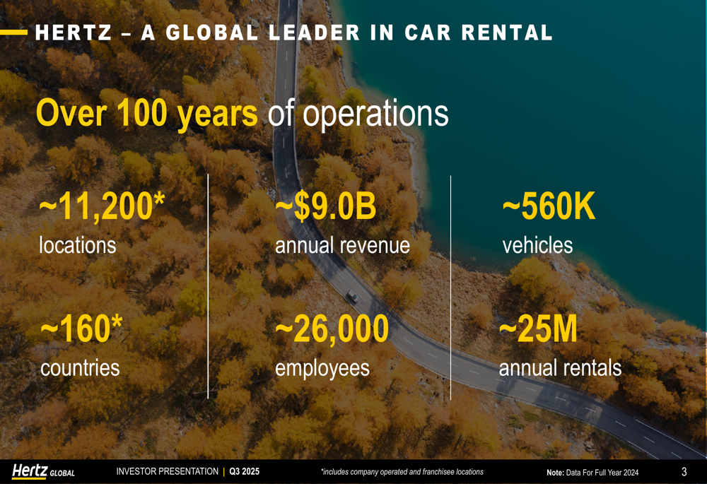 Hertz continues to position itself as a global leader in car rental with approximately 11,200 locations across 160 countries, serving about 25 million annual rentals with a fleet of around 560,000 vehicles: