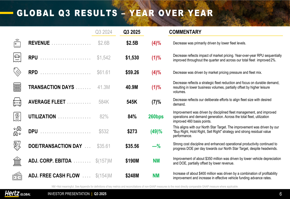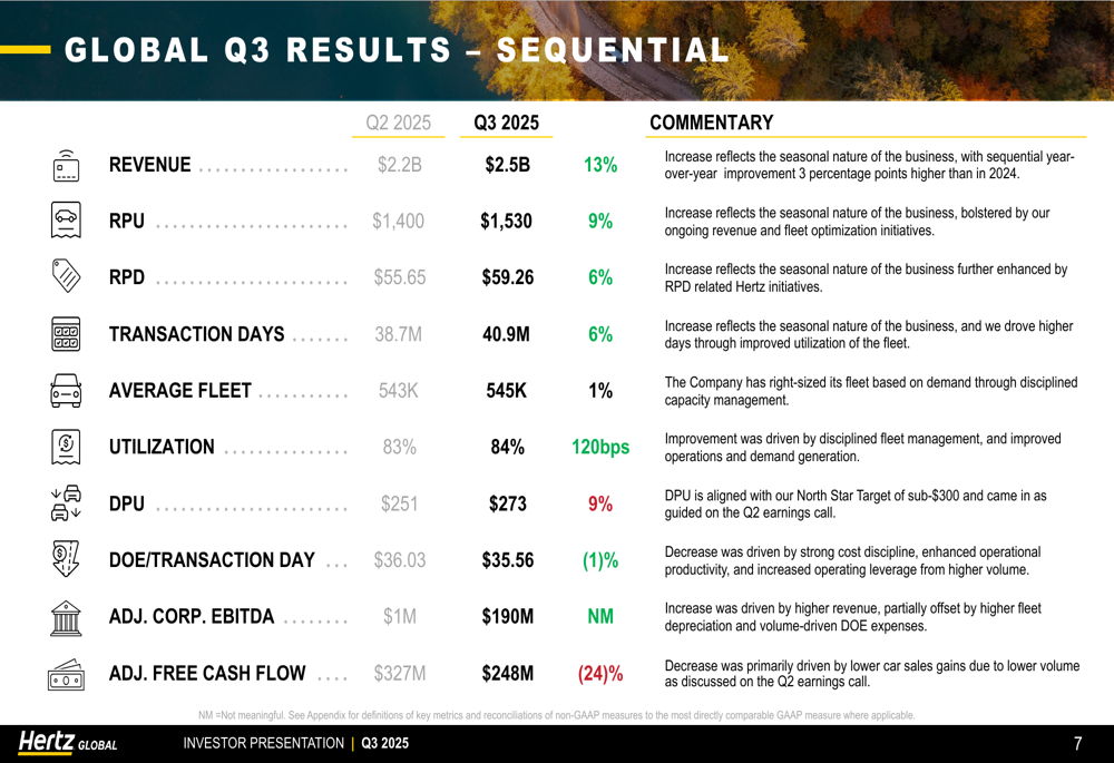 Hertz reported Q3 2025 revenue of $2.5 billion, down 4% year-over-year but up 13% sequentially from Q2. The company achieved a dramatic improvement in profitability, posting Adjusted Corporate EBITDA of $190 million compared to a loss of $157 million in the same quarter last year.