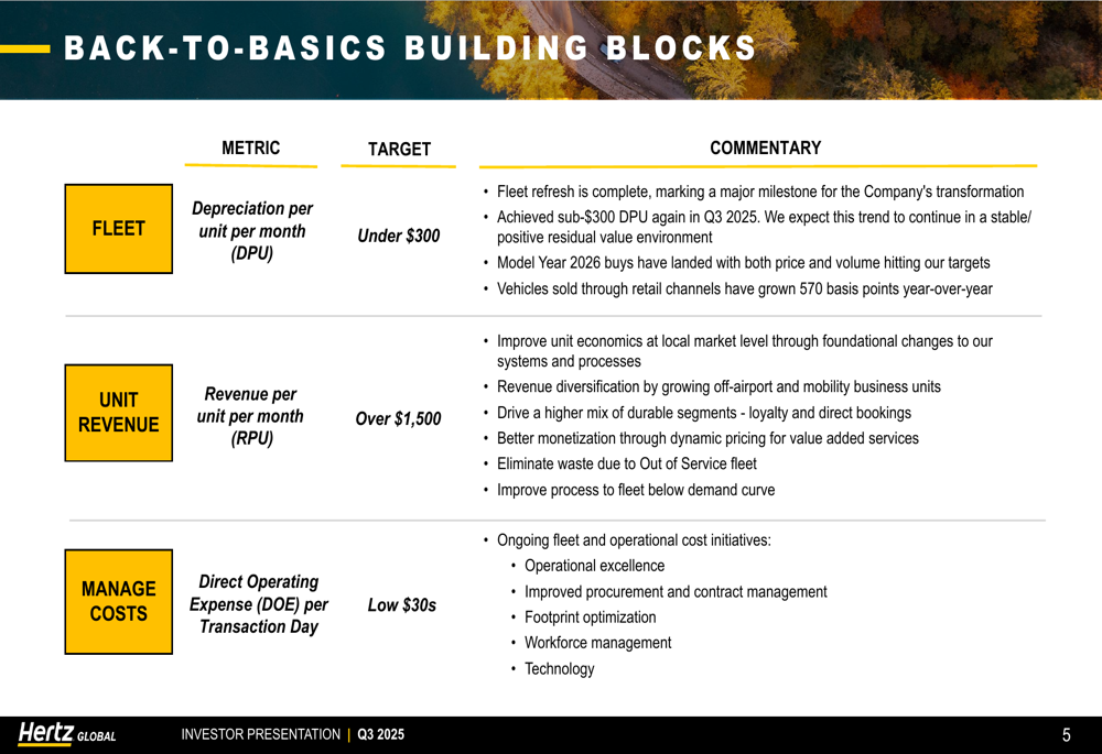 Hertz's presentation emphasized its "Back-to-Basics" strategy, which focuses on three key building blocks: fleet optimization, unit revenue improvement, and cost management. The company has established clear targets for each area: