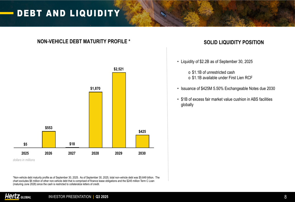 Hertz's financial position shows a solid liquidity profile despite carrying substantial debt. As of September 30, 2025, the company reported $2.2 billion in total liquidity, evenly split between unrestricted cash and available credit facility capacity. The non-vehicle debt maturity profile shows significant obligations coming due in 2028 and 2029: