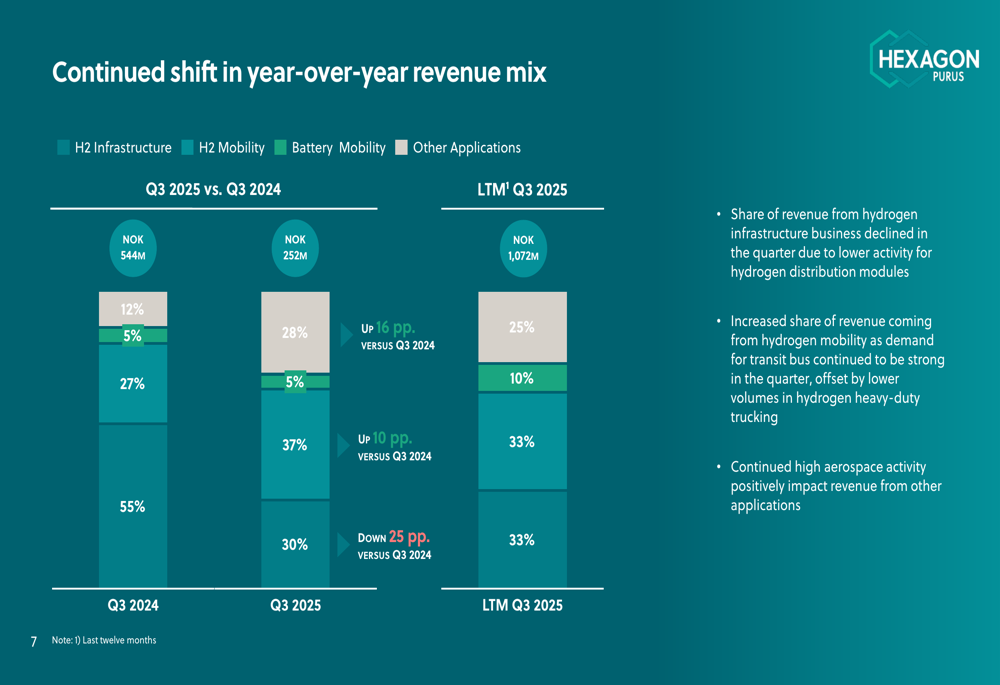 Hexagon Purus experienced a significant shift in its revenue mix year-over-year, with hydrogen infrastructure and mobility gaining importance while battery mobility declined: