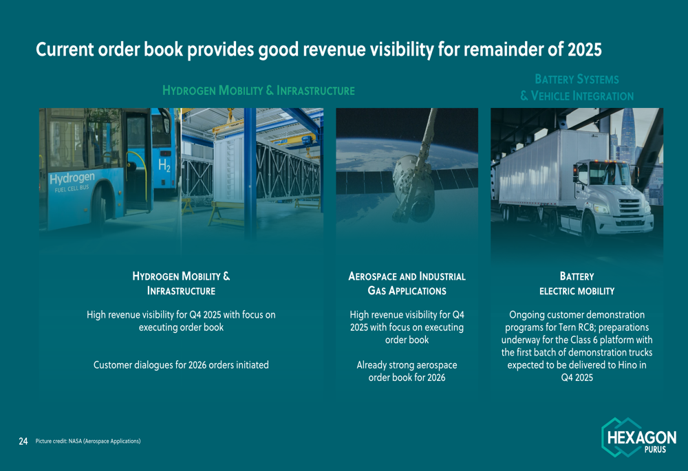 Despite current challenges, Hexagon Purus maintains that its order book provides good revenue visibility for the remainder of 2025, with a focus on executing existing orders while initiating customer dialogues for 2026: