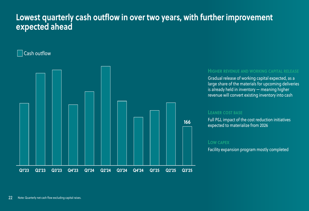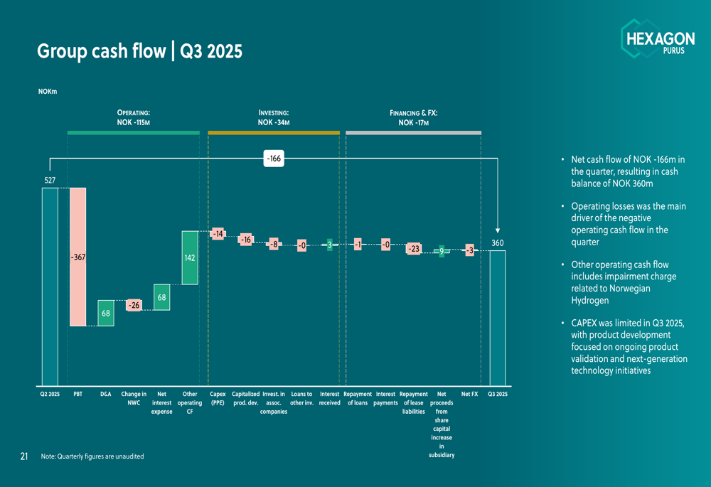 The company’s cash flow statement shows a net cash outflow of NOK 166 million in Q3 2025, with operating losses being the main driver: