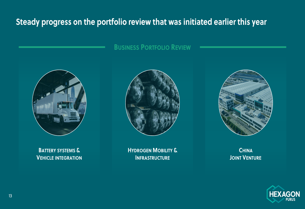 Hexagon Purus is conducting a portfolio review of its three business segments: Battery Systems & Vehicle Integration, Hydrogen Mobility & Infrastructure, and its China Joint Venture. The company reported steady progress on this review, which was initiated earlier in the year: