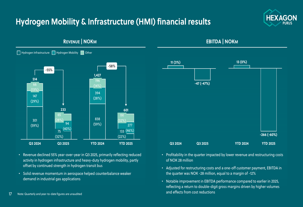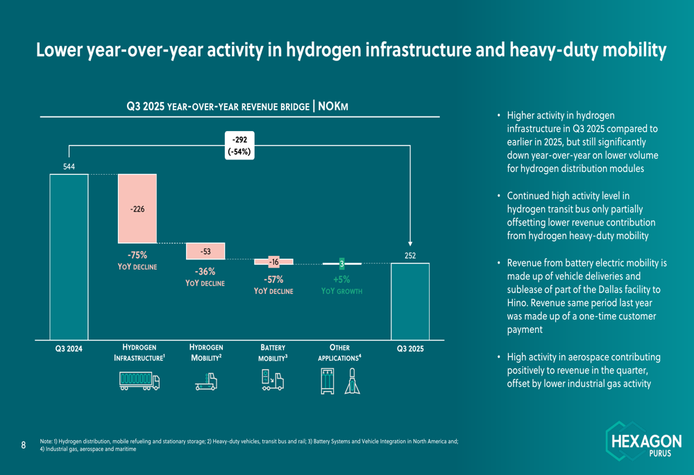 The Hydrogen Mobility & Infrastructure (HMI) segment, which accounts for the majority of the company’s revenue, saw a 55% year-over-year decline in Q3 2025: