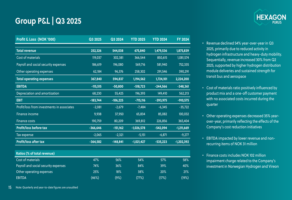Hexagon Purus demonstrated sequential improvement in its financial performance for Q3 2025, though year-over-year comparisons remain challenging. The company’s EBITDA margin improved to -46% in Q3 2025, representing a 38 percentage point improvement quarter-over-quarter, despite being 36 percentage points worse than the same period last year.