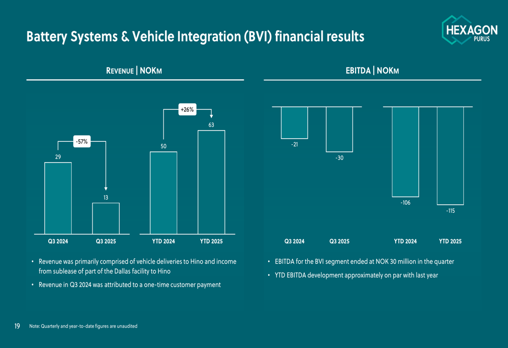 Meanwhile, the Battery Systems & Vehicle Integration (BVI) segment reported revenue of NOK 13 million in Q3 2025, down from NOK 29 million in Q3 2024, with an EBITDA of NOK -30 million: