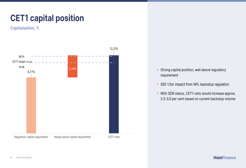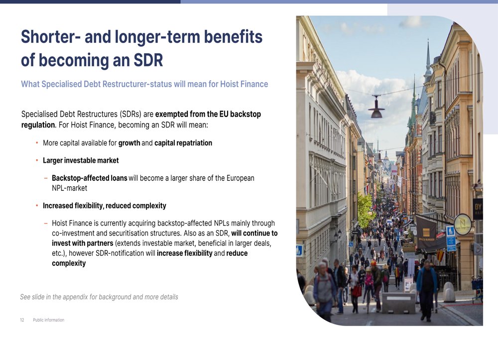 A key strategic focus for Hoist Finance is obtaining Specialized Debt Restructurer (SDR) status, which would exempt the company from EU backstop regulations. The company plans to notify its SDR status in connection with the upcoming Q4 report, which would increase its CET1 ratio by approximately 2.5-3%.
