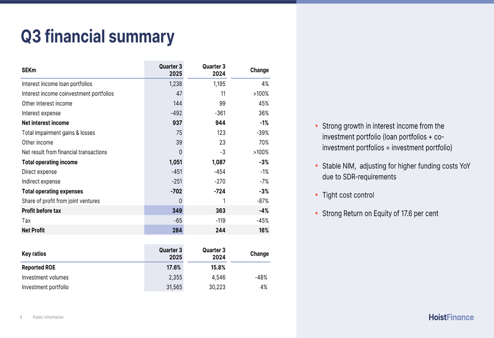 Hoist Finance reported profit before tax of SEK 349 million for Q3 2025, a 4% decrease compared to SEK 363 million in the same quarter last year. However, net profit increased by 16% to SEK 284 million, up from SEK 244 million in Q3 2024. The company achieved a return on equity of 17.6%, a significant improvement from 15.8% in the same period last year.