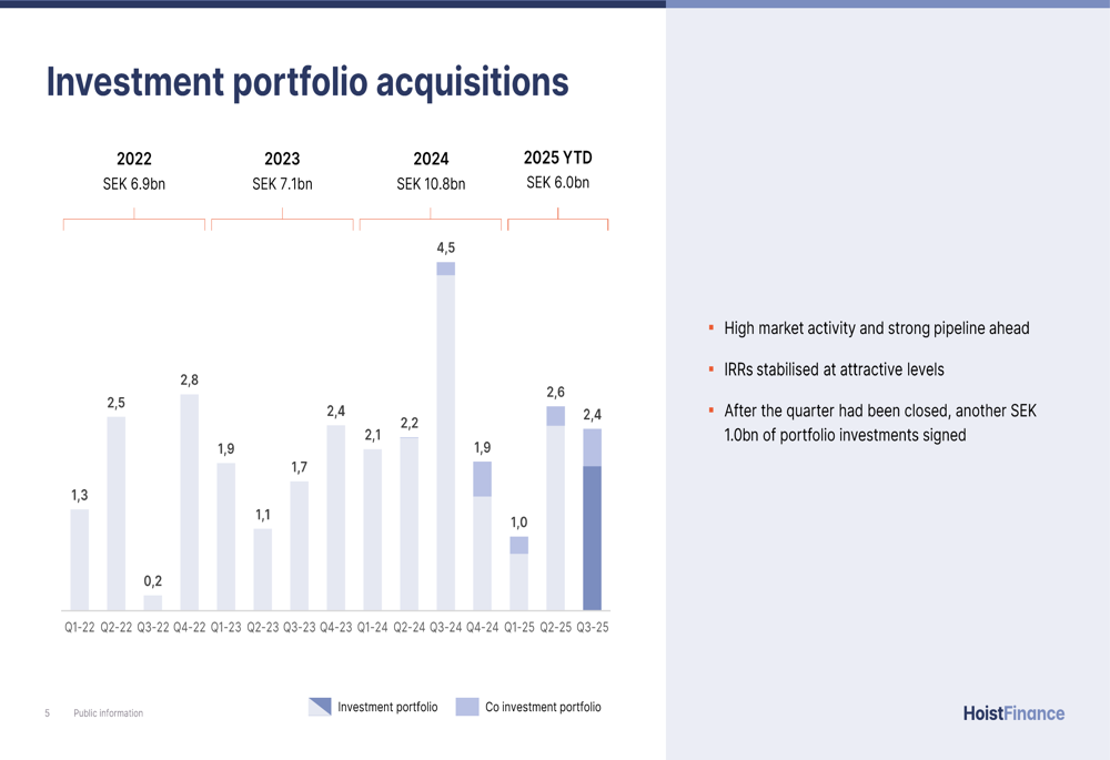 Hoist Finance’s investment portfolio reached SEK 31.6 billion at the end of Q3 2025, representing a 4% increase compared to Q3 2024. The company invested SEK 2.4 billion in new portfolios during the quarter, though this represented a 48% decrease from the SEK 4.5 billion invested in Q3 2024. After the quarter closed, the company signed an additional SEK 1.0 billion in portfolio investments.