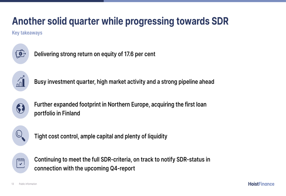 Hoist Finance concluded its presentation by highlighting another solid quarter while progressing toward SDR status:
