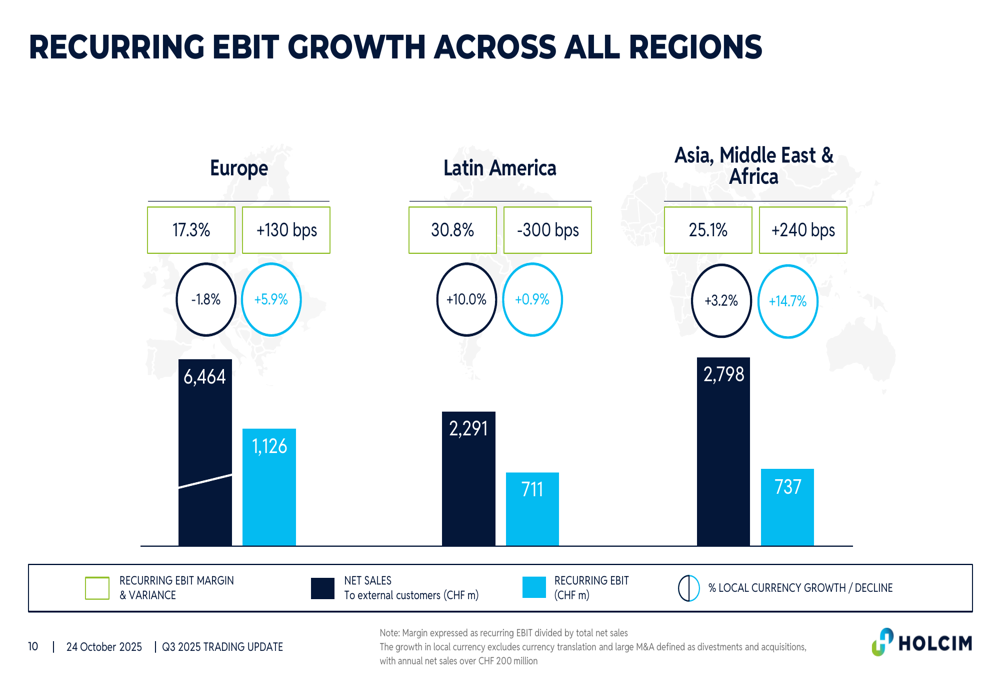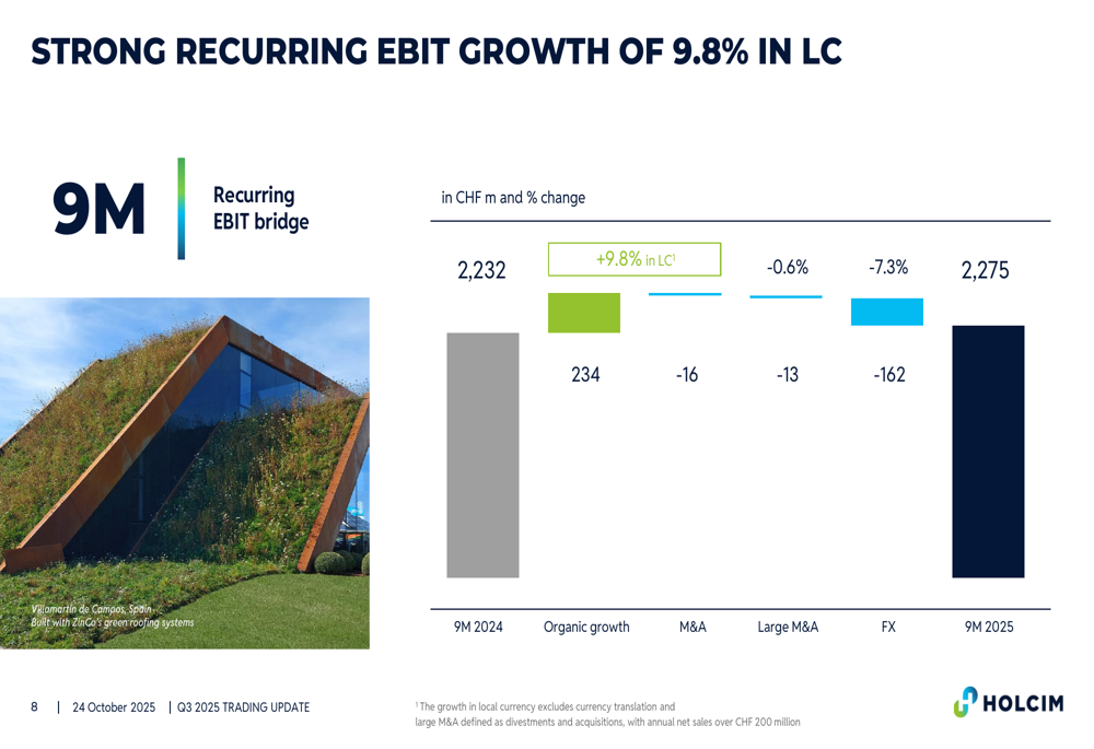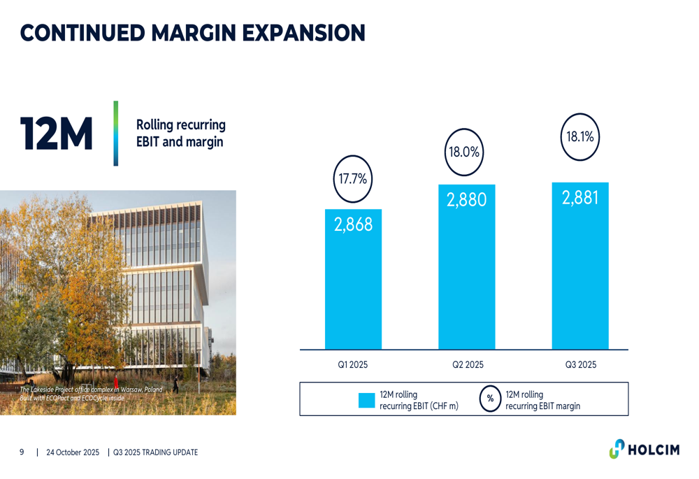 Holcim’s margin expansion continued throughout 2025, with the 12-month rolling recurring EBIT margin reaching 18.1% by Q3: