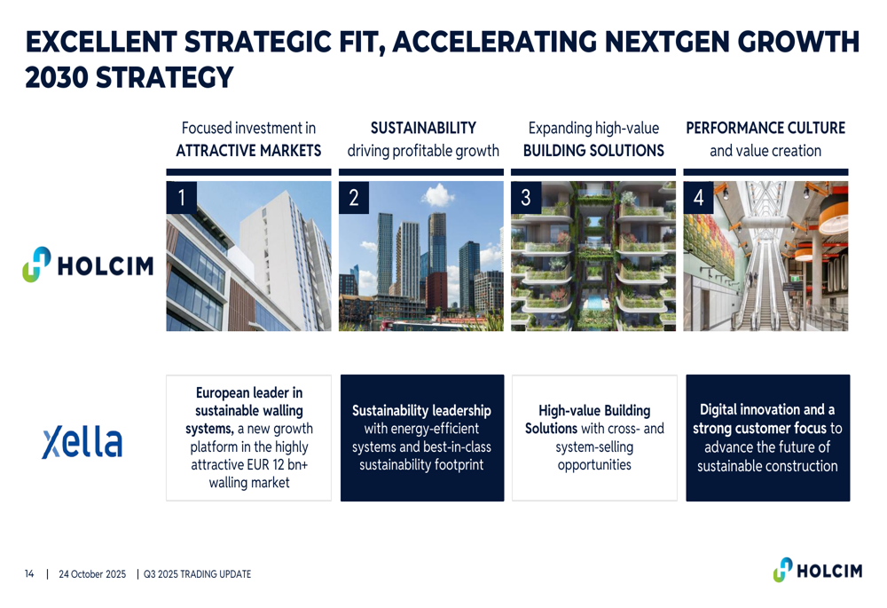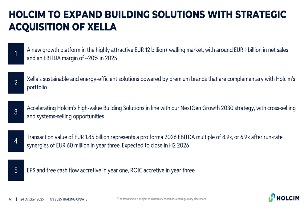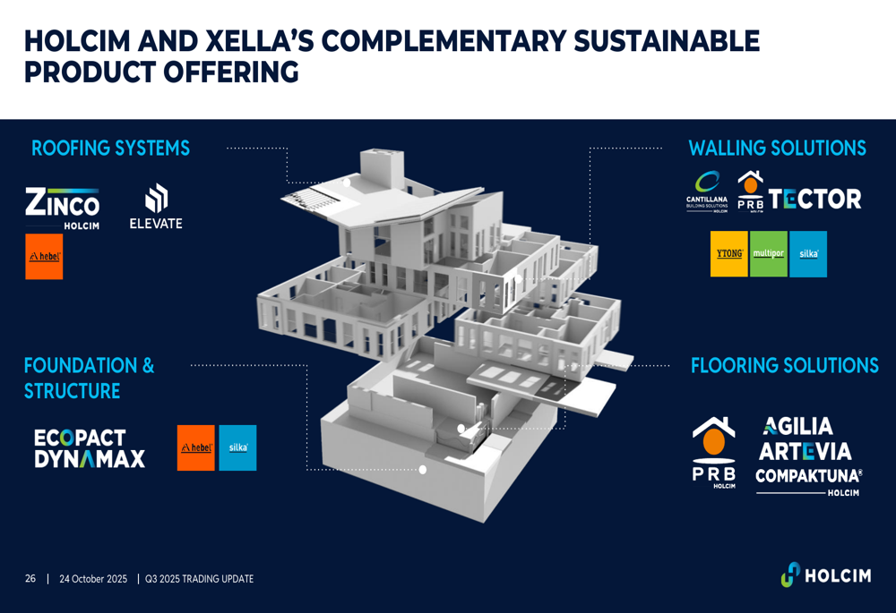 A centerpiece of Holcim’s presentation was the strategic acquisition of Xella, which represents a significant expansion into the European walling market. The EUR 1.85 billion transaction gives Holcim access to a highly attractive market segment with Xella contributing approximately EUR 1 billion in net sales and an EBITDA margin of around 20% in 2025.