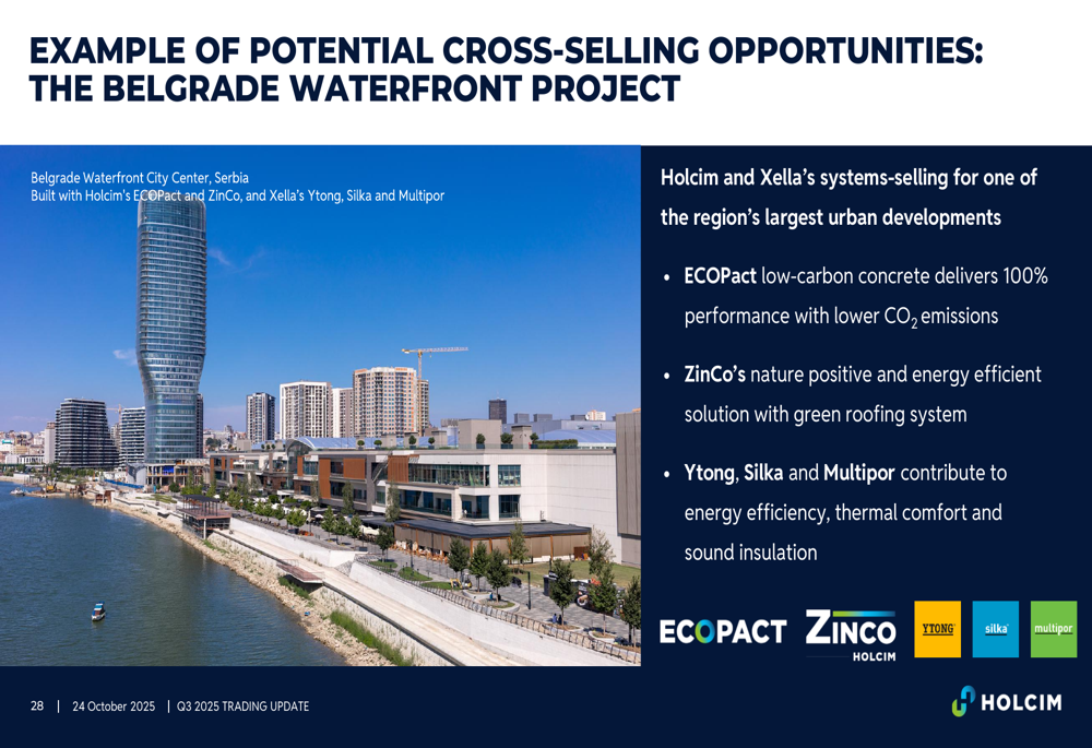 The company highlighted the Belgrade Waterfront Project in Serbia as an example of potential cross-selling opportunities, where Holcim’s ECOPact and ZinCo products were used alongside Xella’s Ytong, Silka, and Multipor solutions: