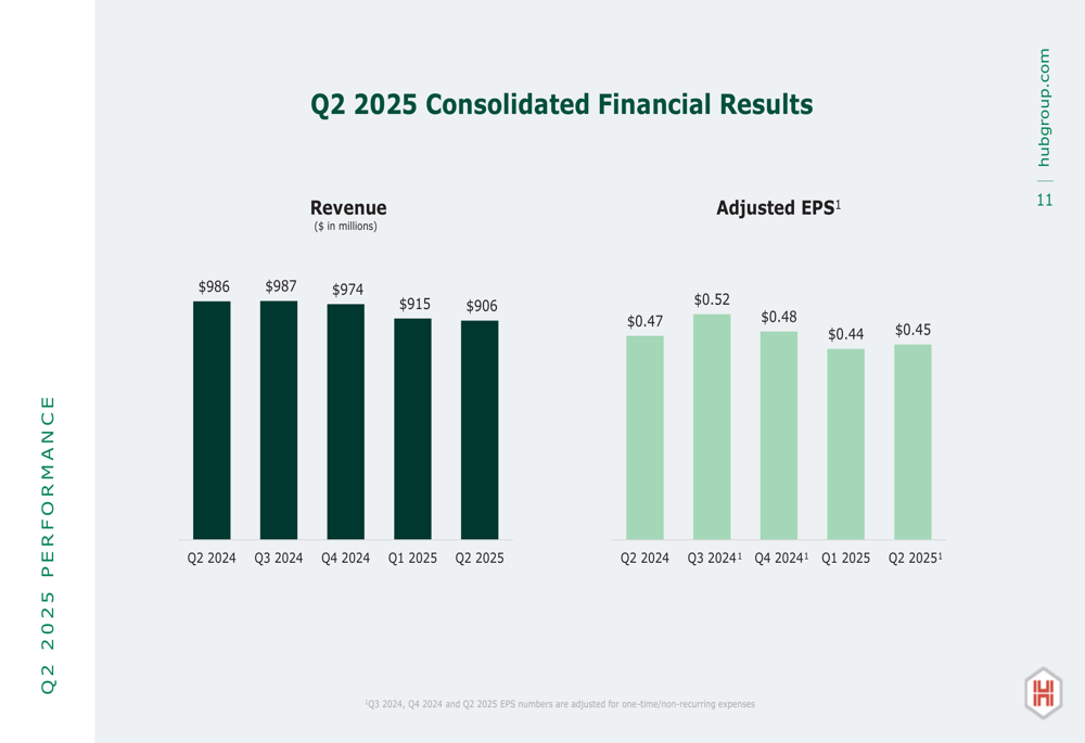 Hub Group reported Q2 2025 revenue of $906 million, down 8% from $986 million in the same quarter last year. Despite the revenue decline, the company maintained relatively stable profitability with adjusted diluted earnings per share of $0.45, compared to $0.47 in Q2 2024. Adjusted operating income reached $37 million, representing 4.1% of revenue, a slight improvement from the 4.0% margin reported in the prior year.