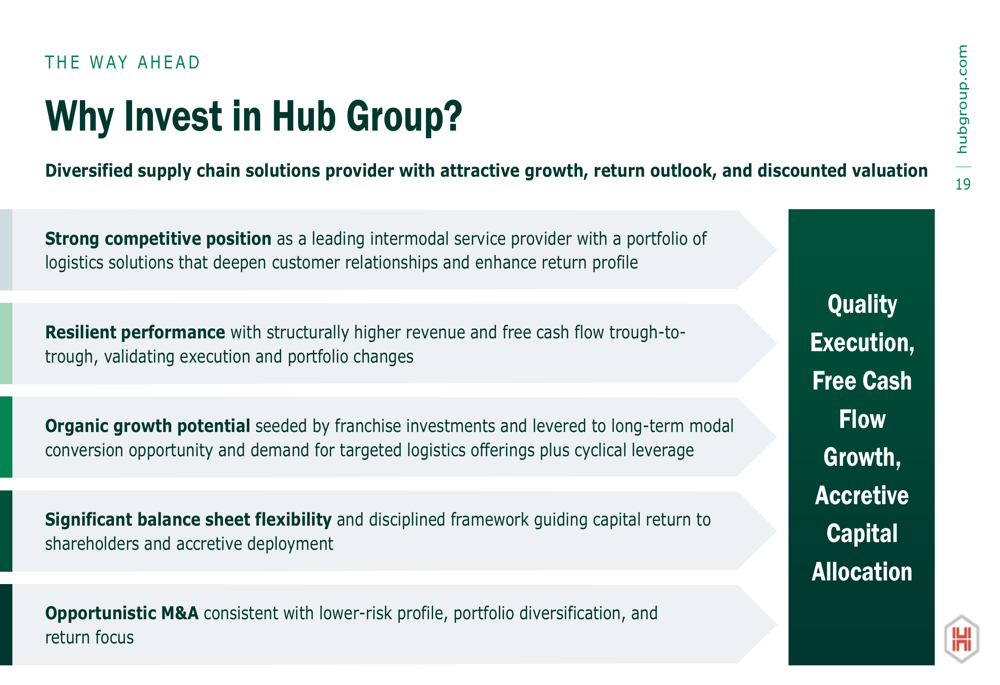 Hub Group’s investment case centers on its strong competitive position, resilient performance through freight market cycles, organic growth potential, and significant balance sheet flexibility. The company’s diversified business model and strategic focus on high-growth areas like temperature-controlled intermodal position it well for long-term success.