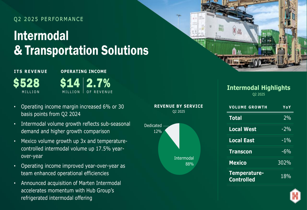 Hub Group’s Intermodal & Transportation Solutions segment generated $528 million in revenue during Q2 2025, with operating income of $14 million (2.7% of revenue). Despite an overall challenging market, the segment showed impressive growth in specific areas, with Mexico volume growth up 302% and temperature-controlled intermodal volume increasing 17.5% year-over-year.