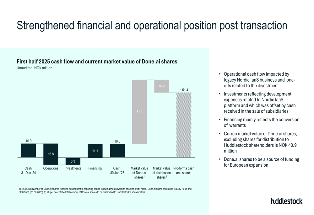 On a pro-forma basis, adjusting for extraordinary costs associated with the Done.ai transaction and expenses related to discontinued operations, Huddlestock’s Q2 2025 EBITDA was negative NOK 4.1 million, compared to the reported negative NOK 6.3 million. This results in a normalized cash burn of approximately NOK 5.9 million.