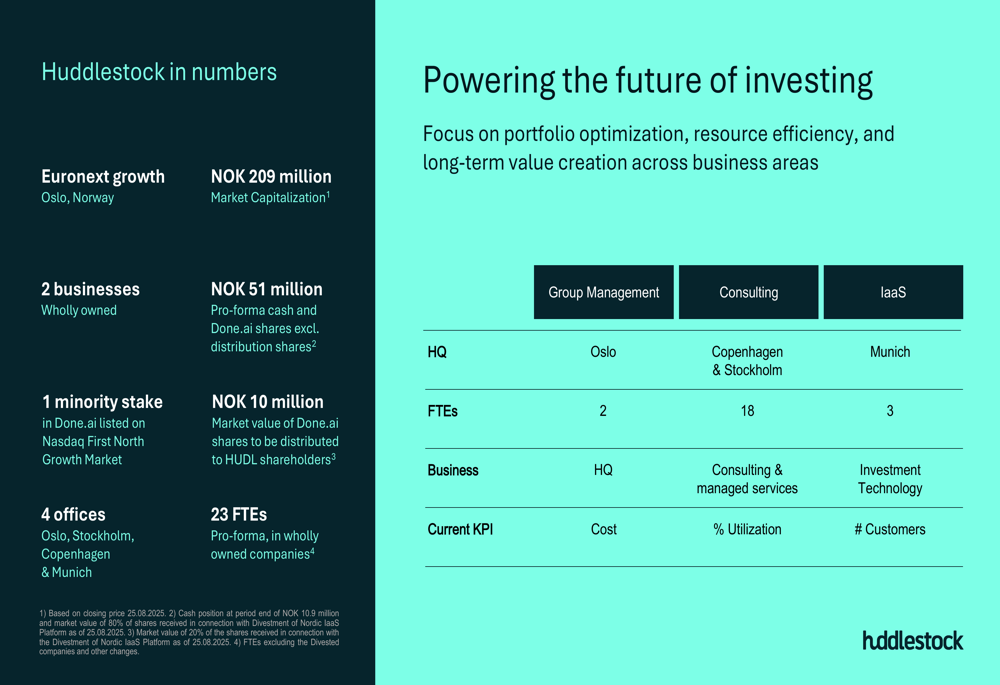 "We are reshaping Huddlestock for future growth in Europe with an asset-light approach," said Leif Arnold Thomas, Group CEO. "The strategic divestment of our Nordic IaaS platform will reduce cash burn and provide funding for our European expansion."
