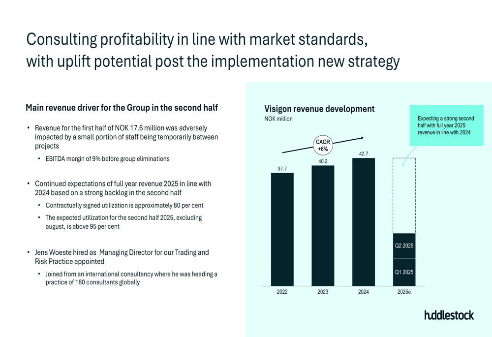 The company’s consulting division, Visigon, is expected to be the main revenue driver for the group in the second half of 2025. Visigon generated revenue of NOK 17.6 million in the first half with an EBITDA margin of 9% before group eliminations. Management expects full-year 2025 revenue to be in line with 2024, based on a strong backlog for the second half.