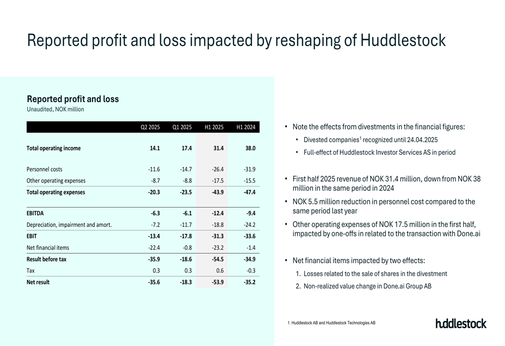 Huddlestock reported total operating income of NOK 31.4 million for H1 2025, down from NOK 38.0 million in the same period last year. The company’s EBITDA deteriorated to negative NOK 12.4 million compared to negative NOK 9.4 million in H1 2024, while net losses widened significantly to NOK 53.9 million from NOK 35.2 million a year earlier.