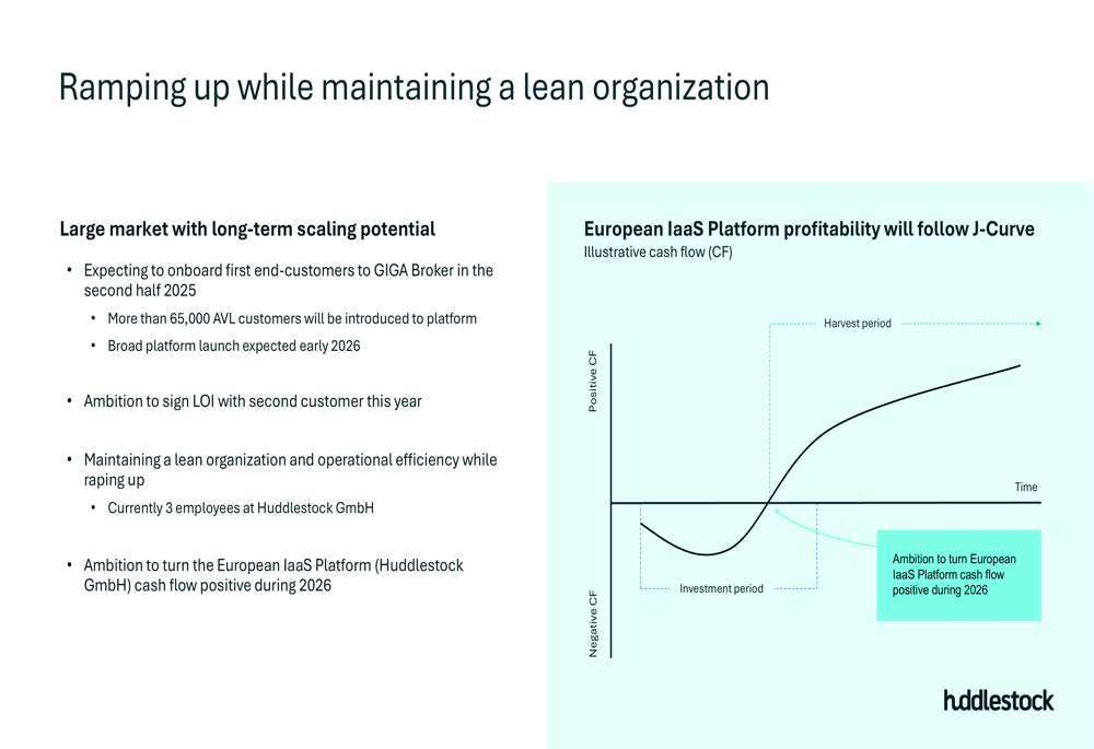 Huddlestock projects that its European IaaS Platform will follow a J-curve profitability model, with an initial investment period followed by a harvest period. The company aims to turn the platform cash flow positive during 2026.