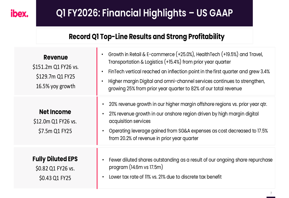 IBEX reported impressive financial results for Q1 FY2026, with revenue reaching $151.2 million, representing a 16.5% year-over-year increase from $129.7 million in Q1 FY2025. Net income rose significantly to $12.0 million from $7.5 million in the prior year quarter, while fully diluted EPS nearly doubled to $0.82 from $0.43.