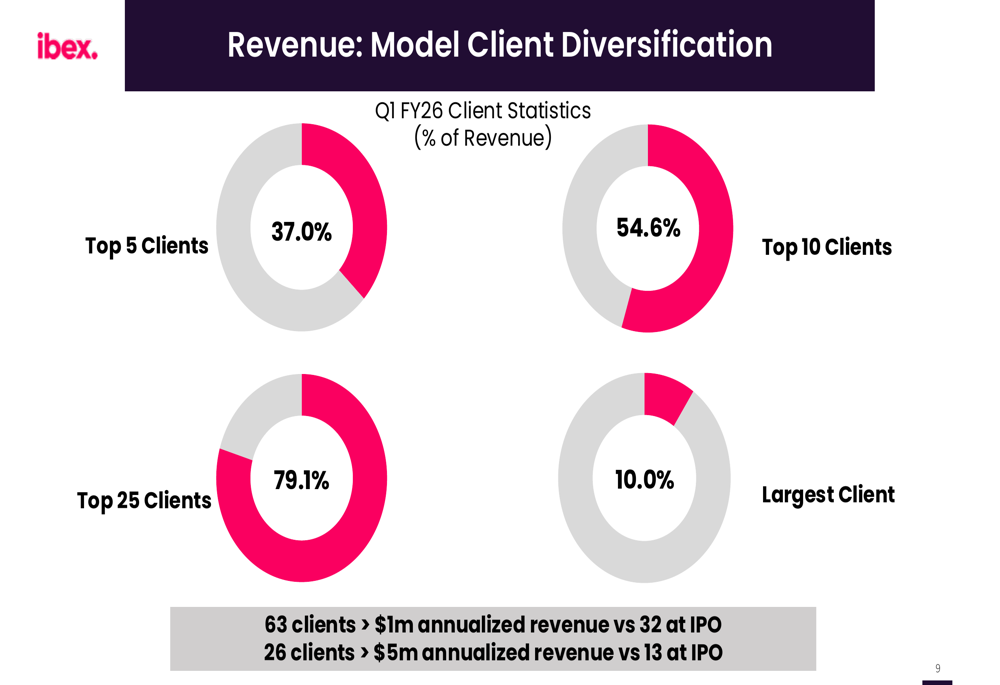 Client diversification remains a key strength for IBEX. The company now has 63 clients generating over $1 million in annualized revenue, up from 51 in Q1 FY2024. Particularly notable is the 67% increase in clients generating $10-20 million in annual revenue, growing from 6 to 10 over the same period.