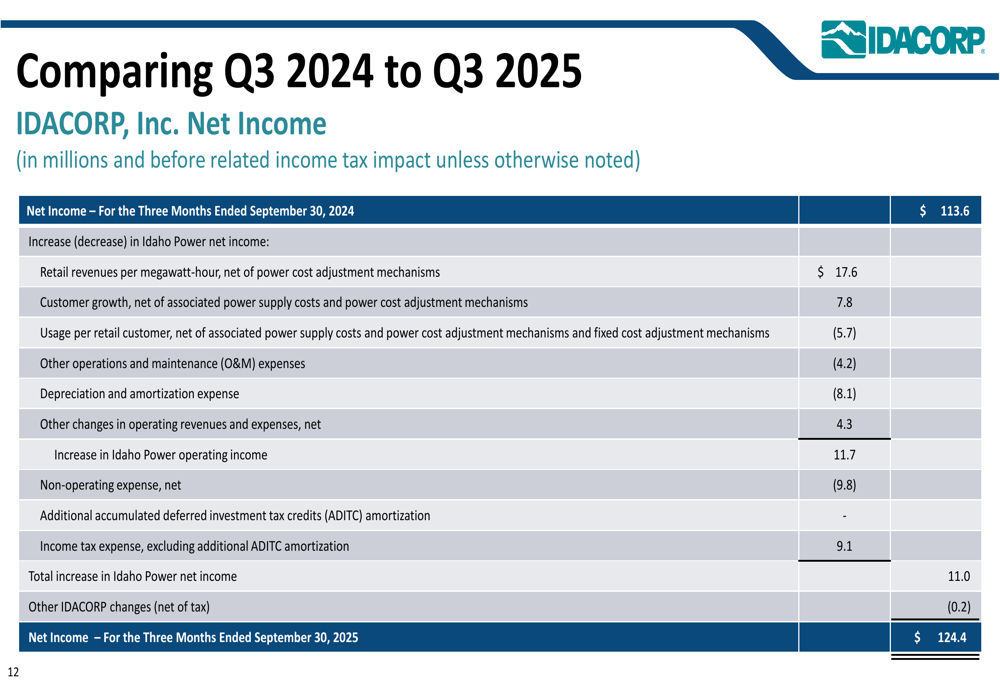 For the nine months ended September 30, 2025, IDACORP reported net income of $279.9 million, or $5.13 per diluted share, up from $251.3 million, or $4.82 per diluted share, for the same period in 2024.