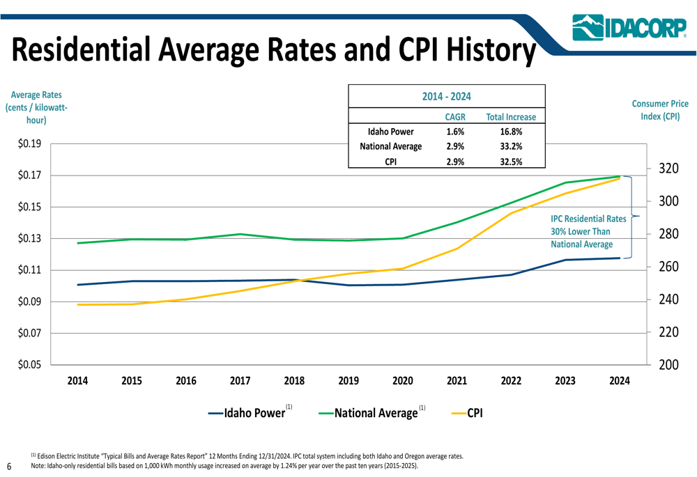Despite this increase, IDACORP maintains a competitive advantage with residential rates that are 30% lower than the national average. Over the past decade (2014-2024), the company’s average rate increase was just 1.6% annually (16.8% total), compared to the national average of 2.9% annually (33.2% total) and CPI growth of 2.9% annually (32.5% total).
