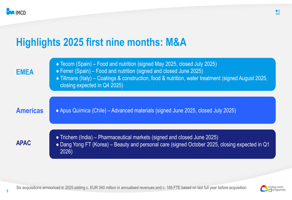 A central element of IMCD’s growth strategy continues to be its active pursuit of acquisitions. During the first nine months of 2025, the company announced six acquisitions across its global operations, adding approximately €340 million in annualized revenues and 185 full-time employees based on the last full year before acquisition.